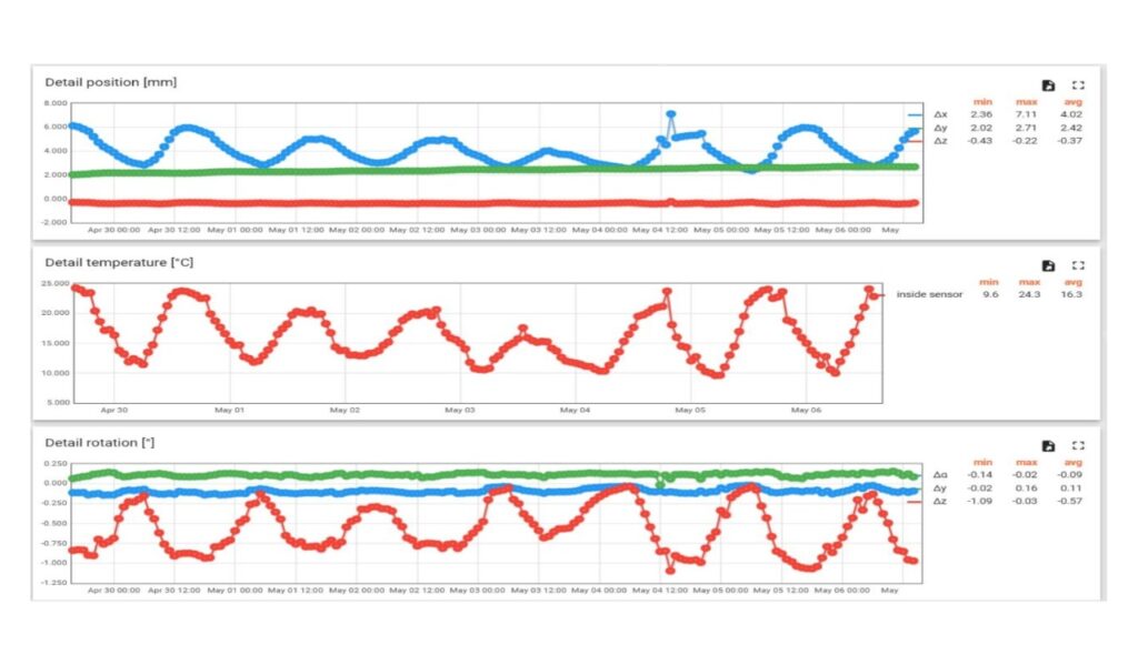 Mjeri apsolutne pomake duž osi X, Y i Z s ponovljivošću od 0,05 mm (50 µm), što ga čini idealnim za praćenje pukotina, dilatacijskih fuga, slijeganja ili strukturnih pomaka na građevinama i infrastrukturnim objektima. Za razliku od tradicionalnih senzora, SuessCo 3D senzor pruža kontinuirane podatke – digitalno, dokumentirano i dostupno na daljinu putem korisničkog sučelja.